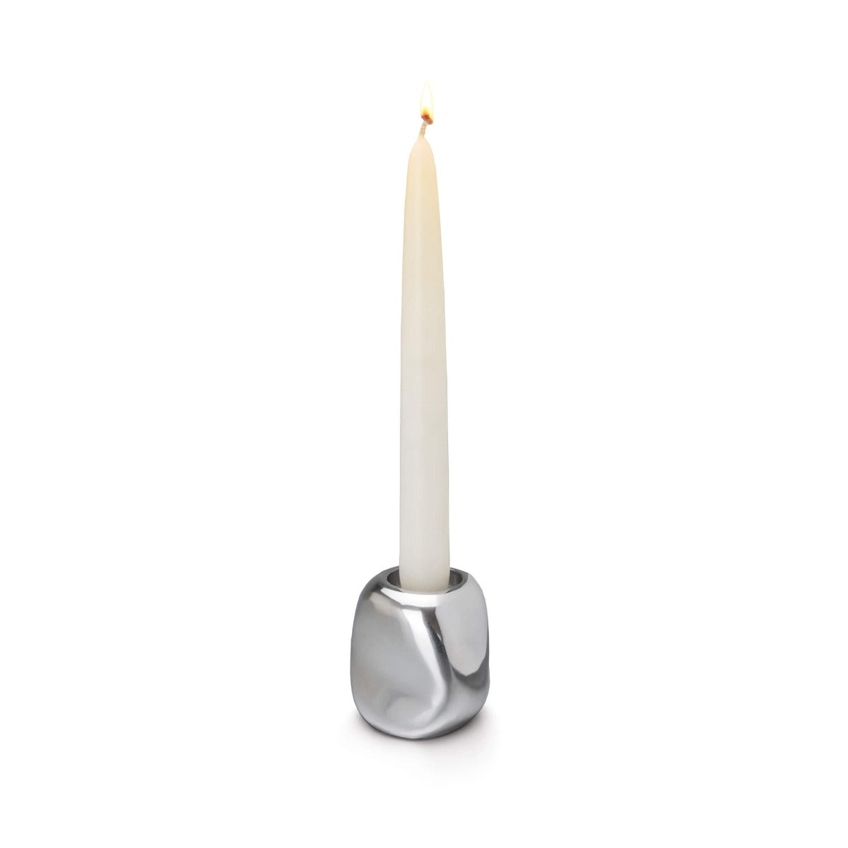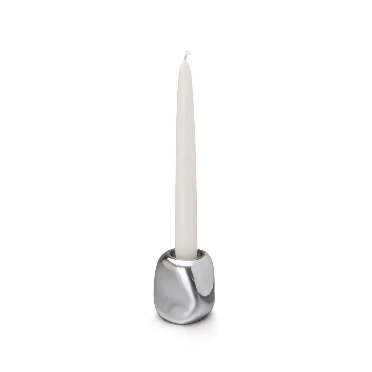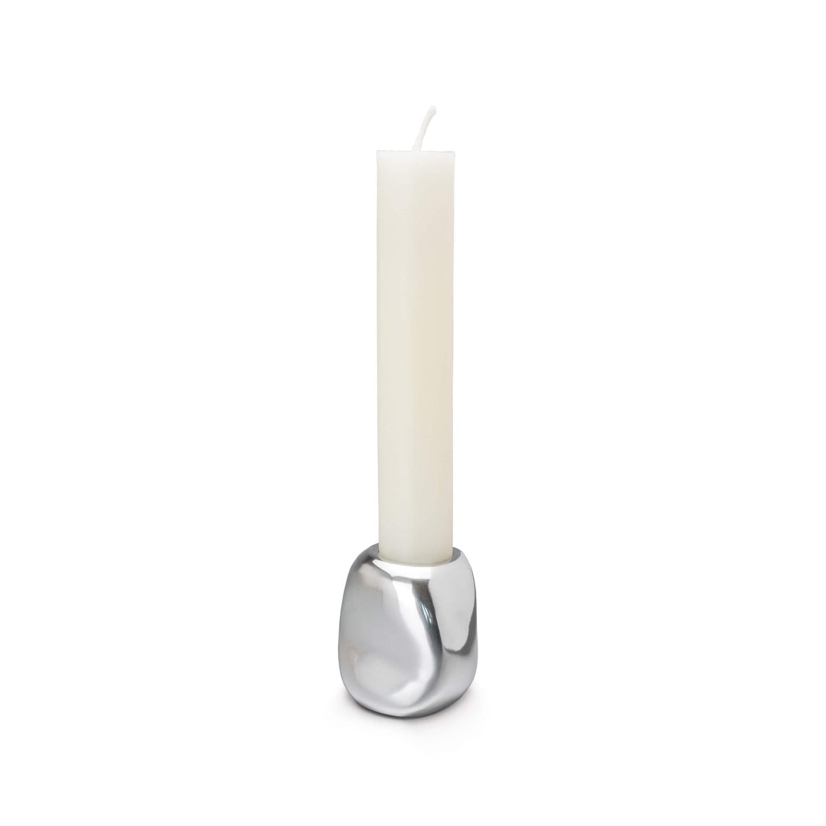 Completate la vostra tavola con questo esclusivo portacandele in metallo fuso, perfetto complemento per i nostri articoli in vetro e ceramica. Il nostro design trae ispirazione dalle levigate pietre di fiume, con una finitura lucida che aggiunge lucentezza e brillantezza a qualsiasi ambiente.