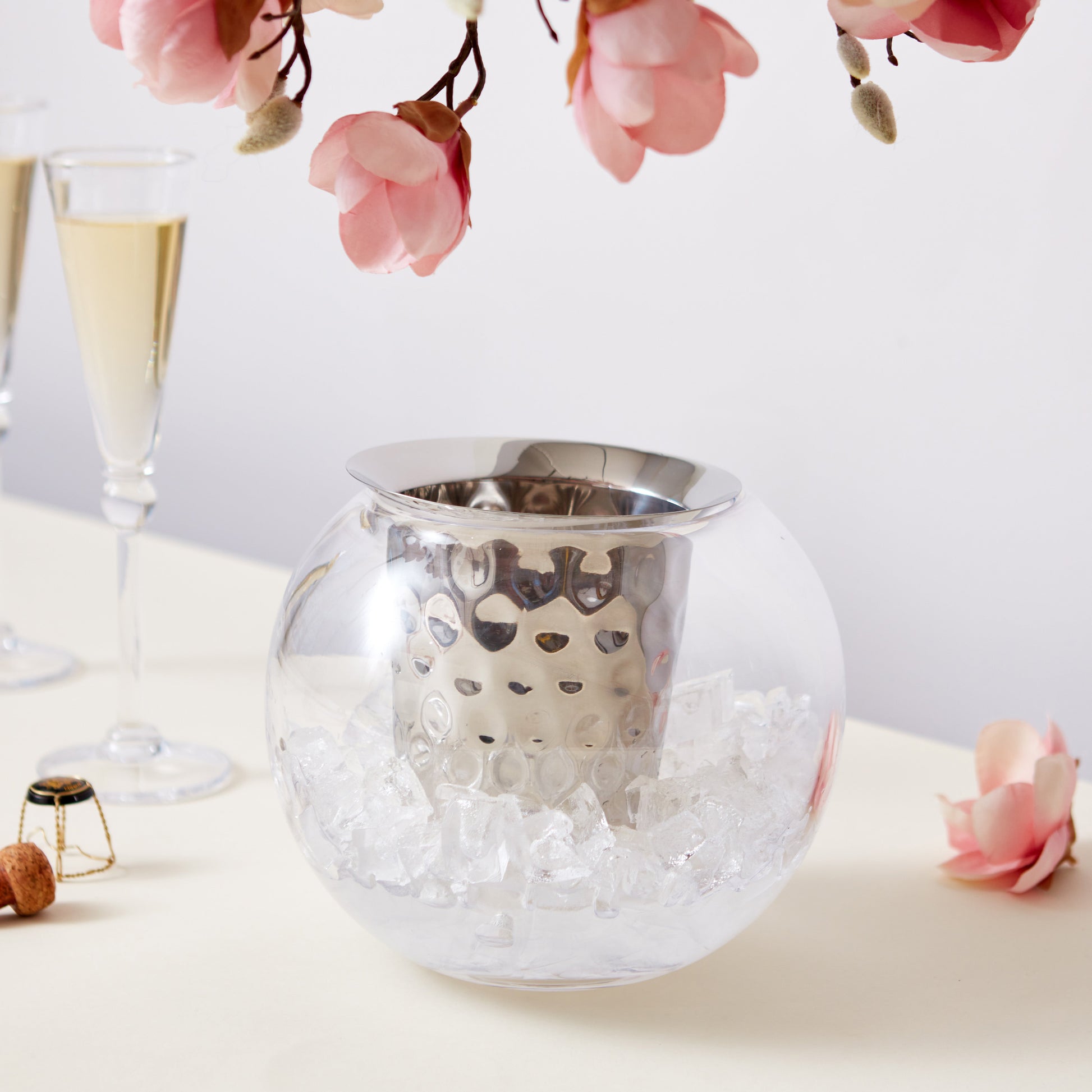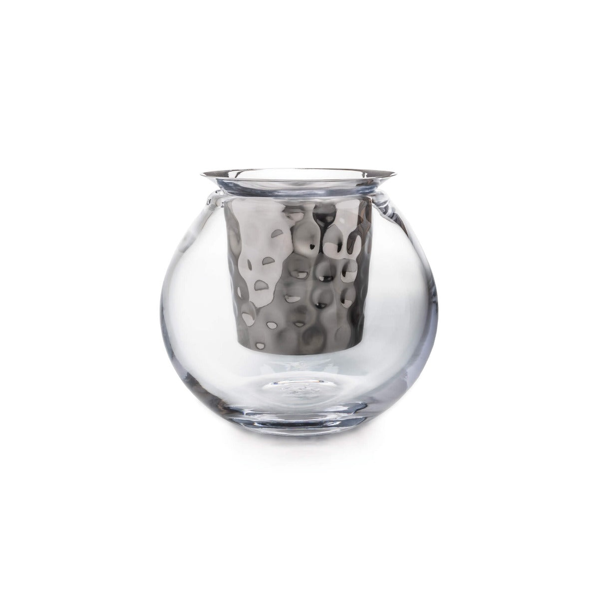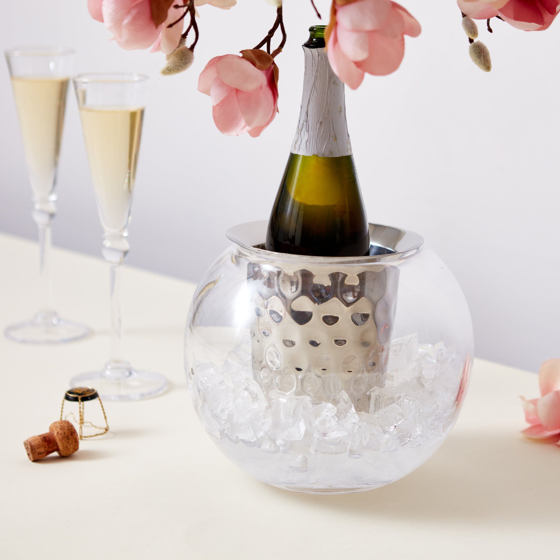 Un'interpretazione completamente nuova del secchiello del ghiaccio, tanto esteticamente sbalorditiva quanto funzionale. Il manicotto in acciaio inossidabile martellato personalizzato si adatta perfettamente alla nostra scintillante silhouette a globo in vetro Hampton. Riempi quest'ultimo di ghiaccio, infila il manicotto e mantieni il tuo vino fresco e asciutto grazie a questo splendido (e geniale) pezzo di tecnica mista. La ciotola profonda funge anche da terrario o da porta-rose. Questo nuovo classico si sta già guadagnando il suo posto come pezzo distintivo.