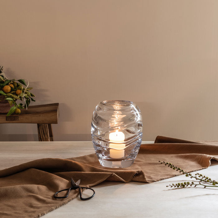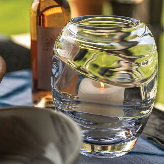 Un effetto stratificato che si verifica durante il processo di soffiatura del vetro: il design a doppia piega di Waterbury cattura la sensazione del movimento, non diversamente dai fiumi impetuosi delle Glen Falls della città. Queste sovrapposizioni ottiche catturano e rifrangono brillantemente la luce quando illuminate dall'interno.