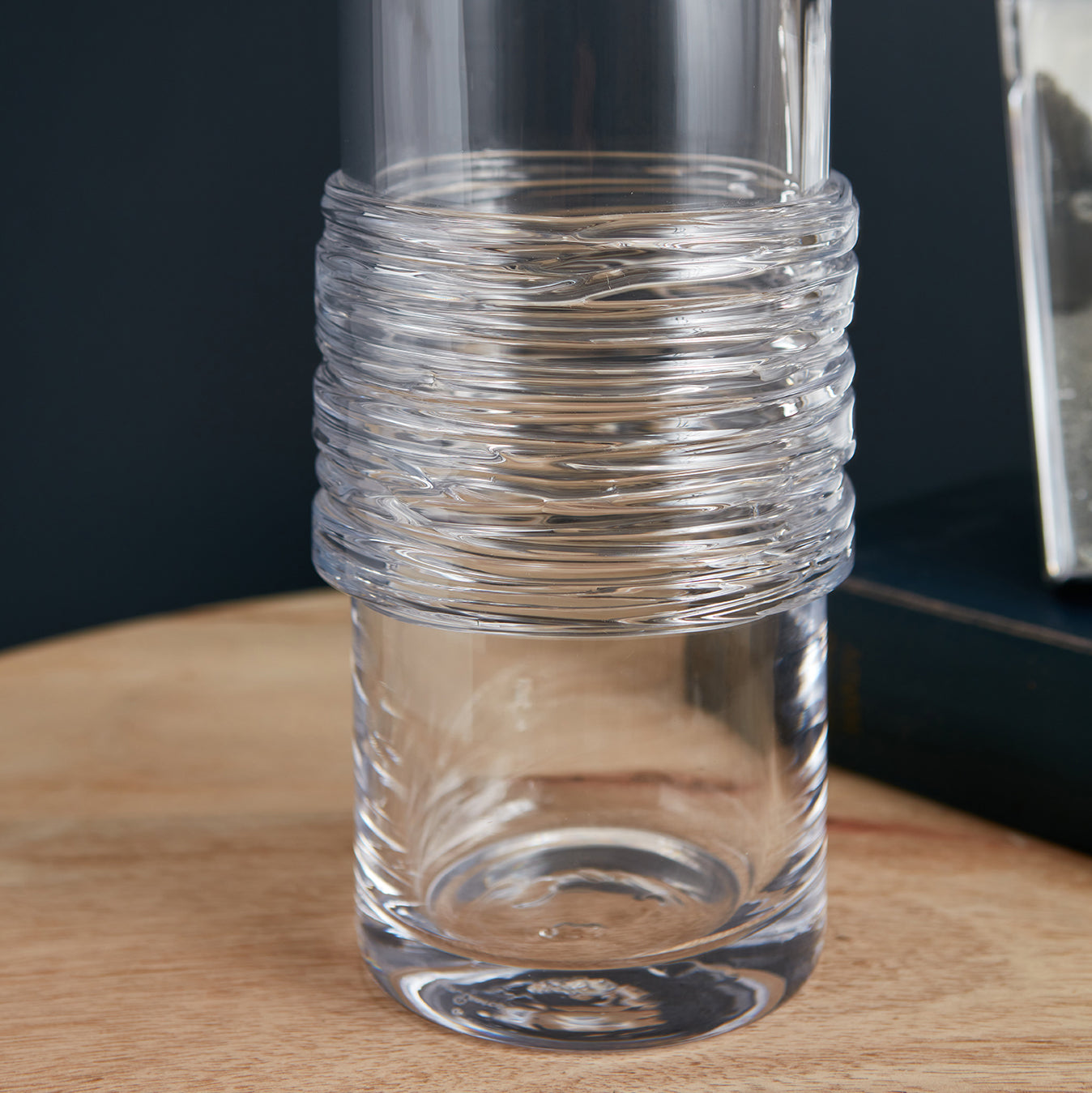 Ispirati dai corsi d'acqua del Vermont in costante cambiamento, i nostri maestri vetrai avvolgono abilmente sottili fili di vetro attorno a una sezione di questo vaso cilindrico, creando un contrasto materico con il vetro trasparente brillante sopra e sotto. L'illuminazione mette in luce le texture uniche di questa lampada fatta a mano.